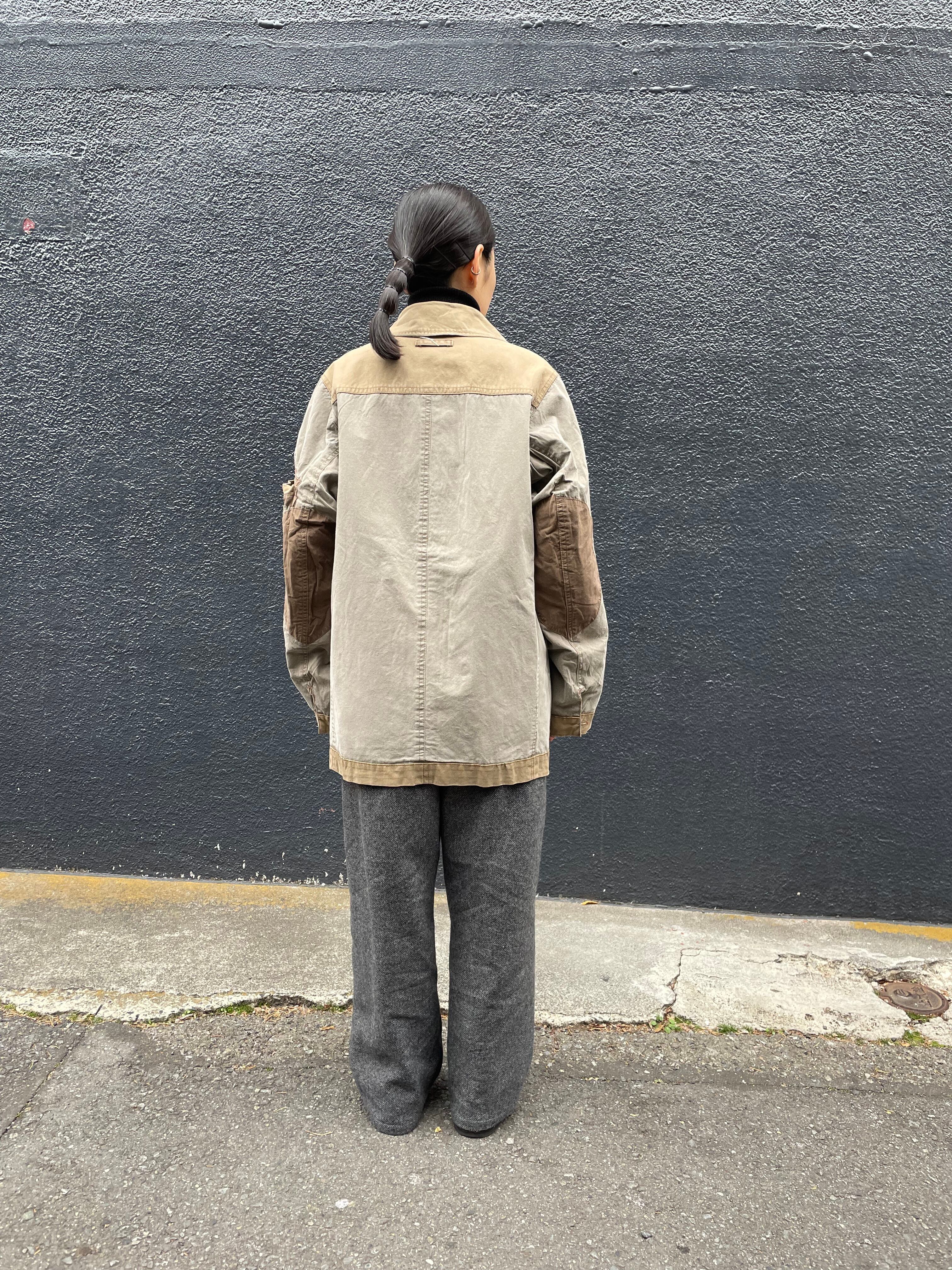 表側はシンプルなベージュ、裏側はグレーにブラウンのポケットがパッチワークのような楽しいデザインです。2つの表情で、気分やシーンに合わせて雰囲気を変えたコーディネートが楽しめます。