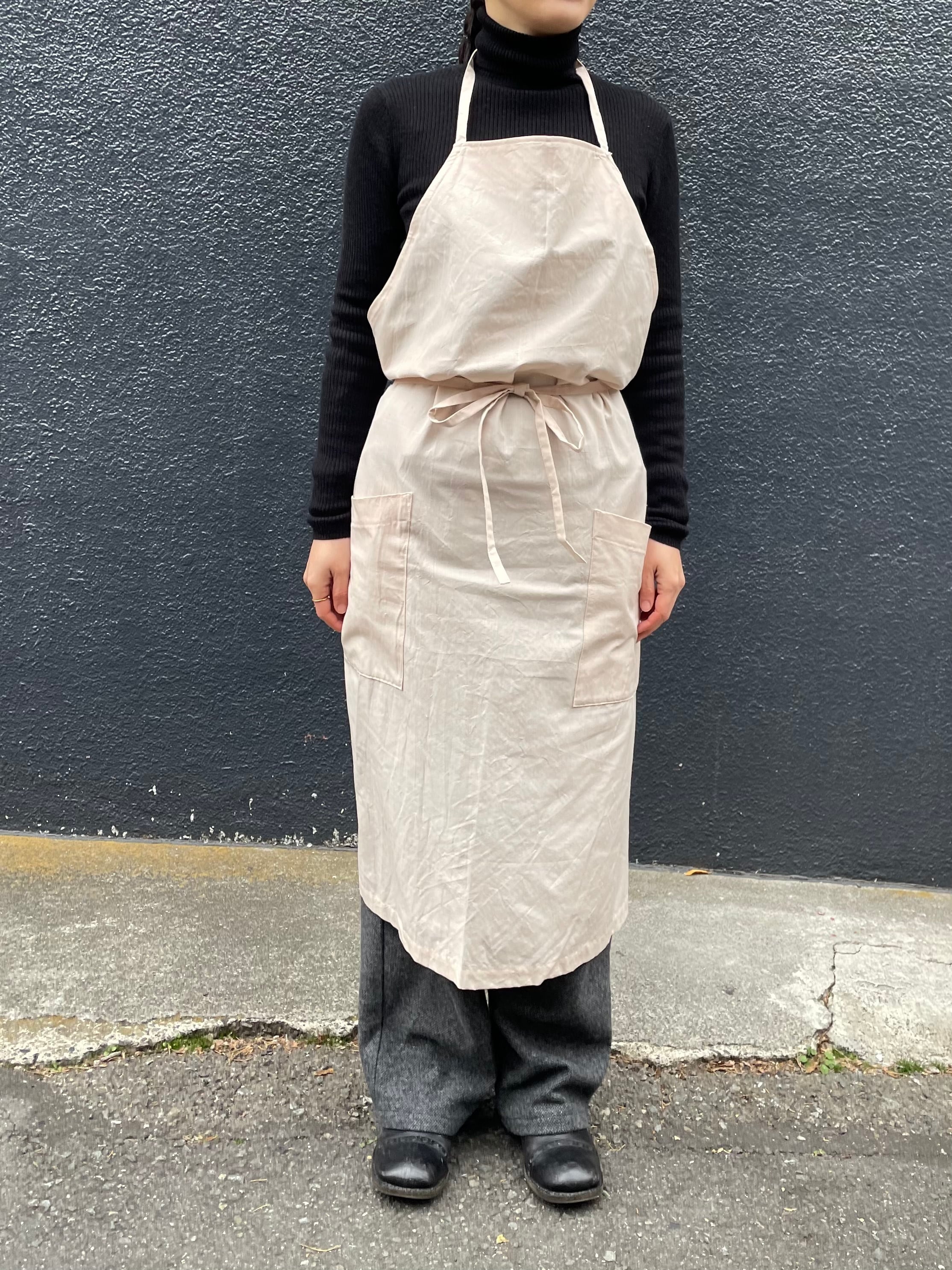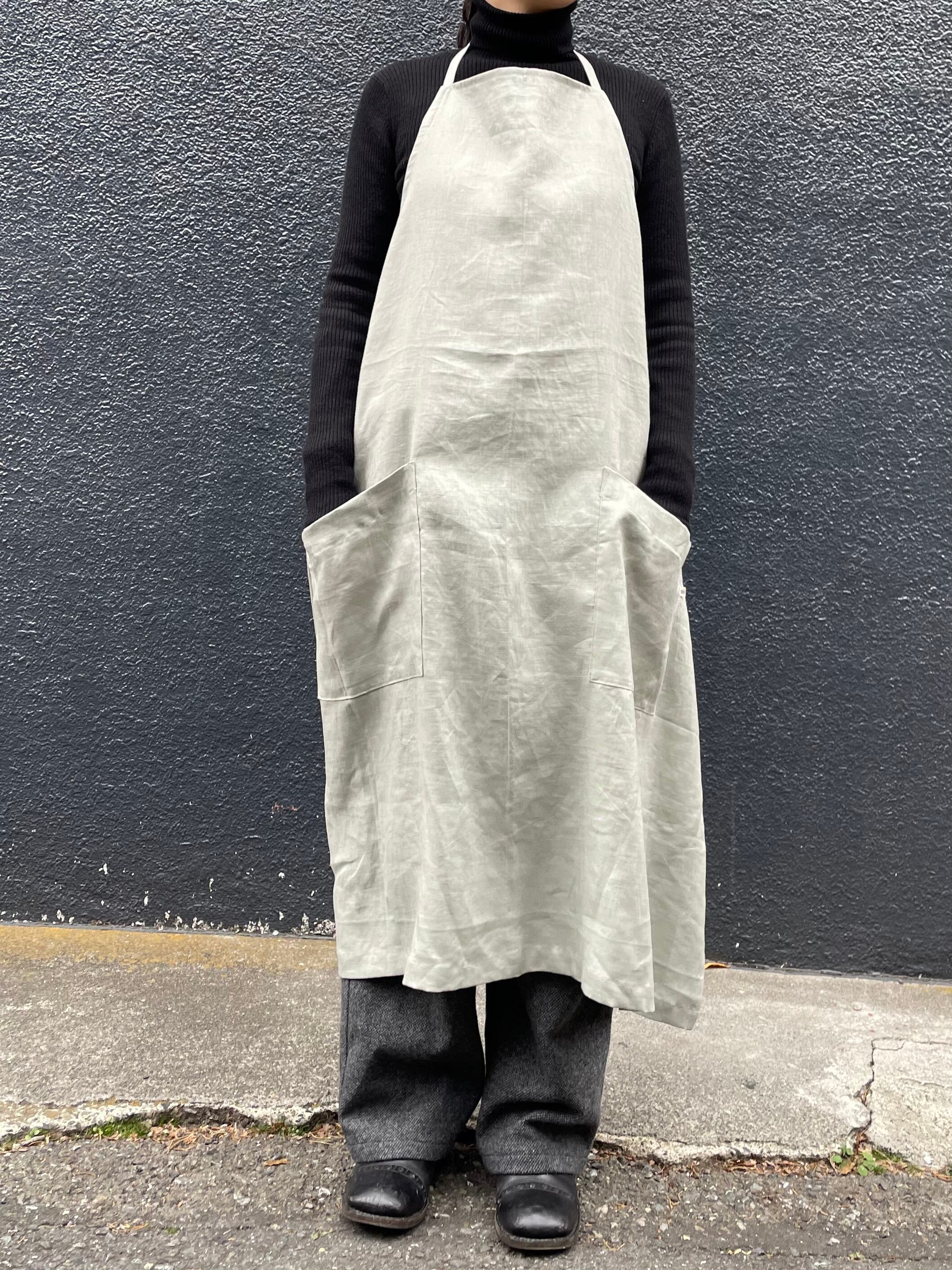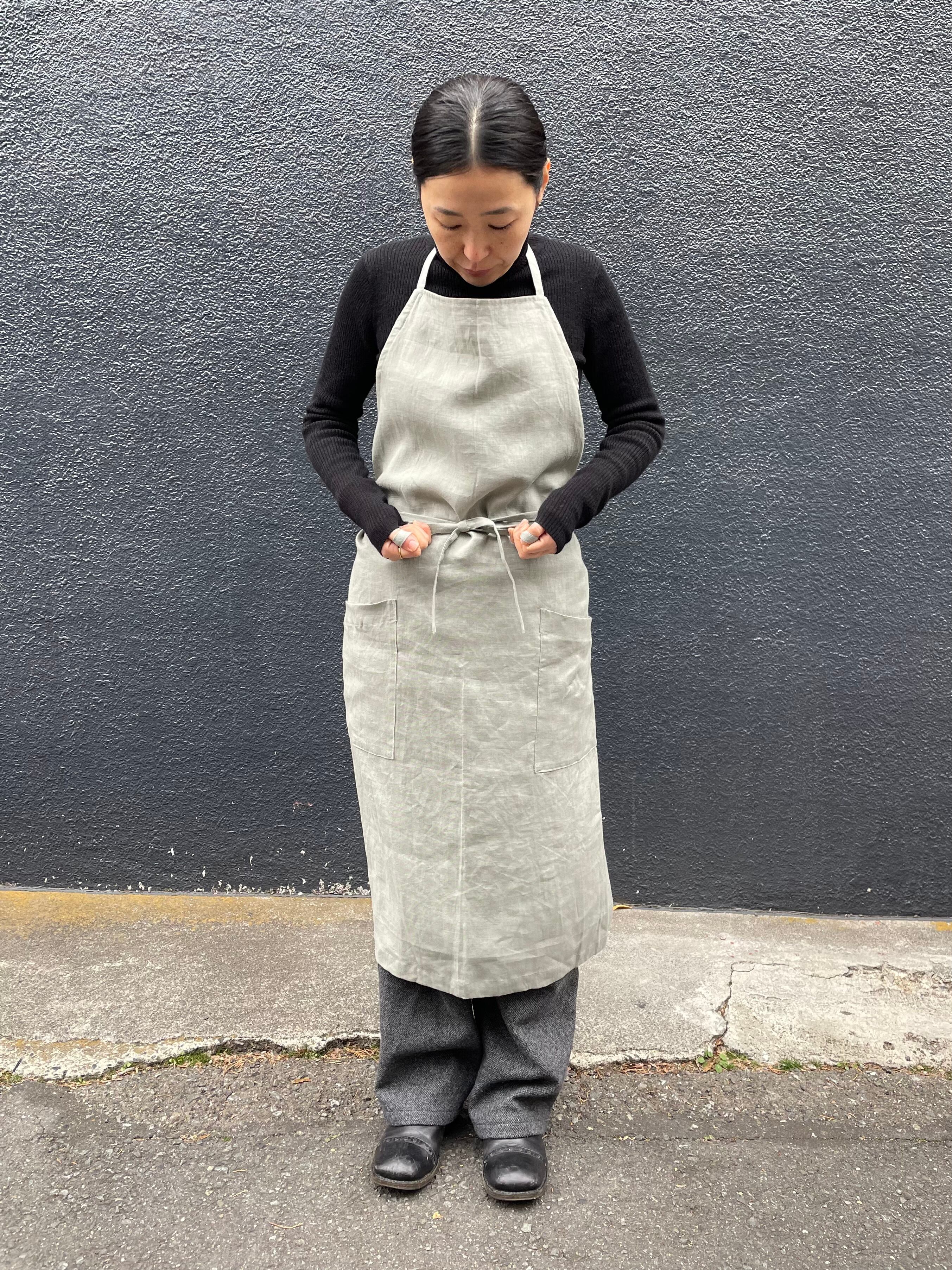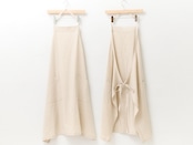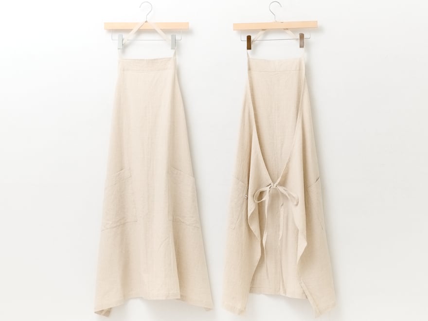 ベージュとスチールは麻100%、うすピンクはイカット機で織った無地の手織り生地でつくったエプロンです。