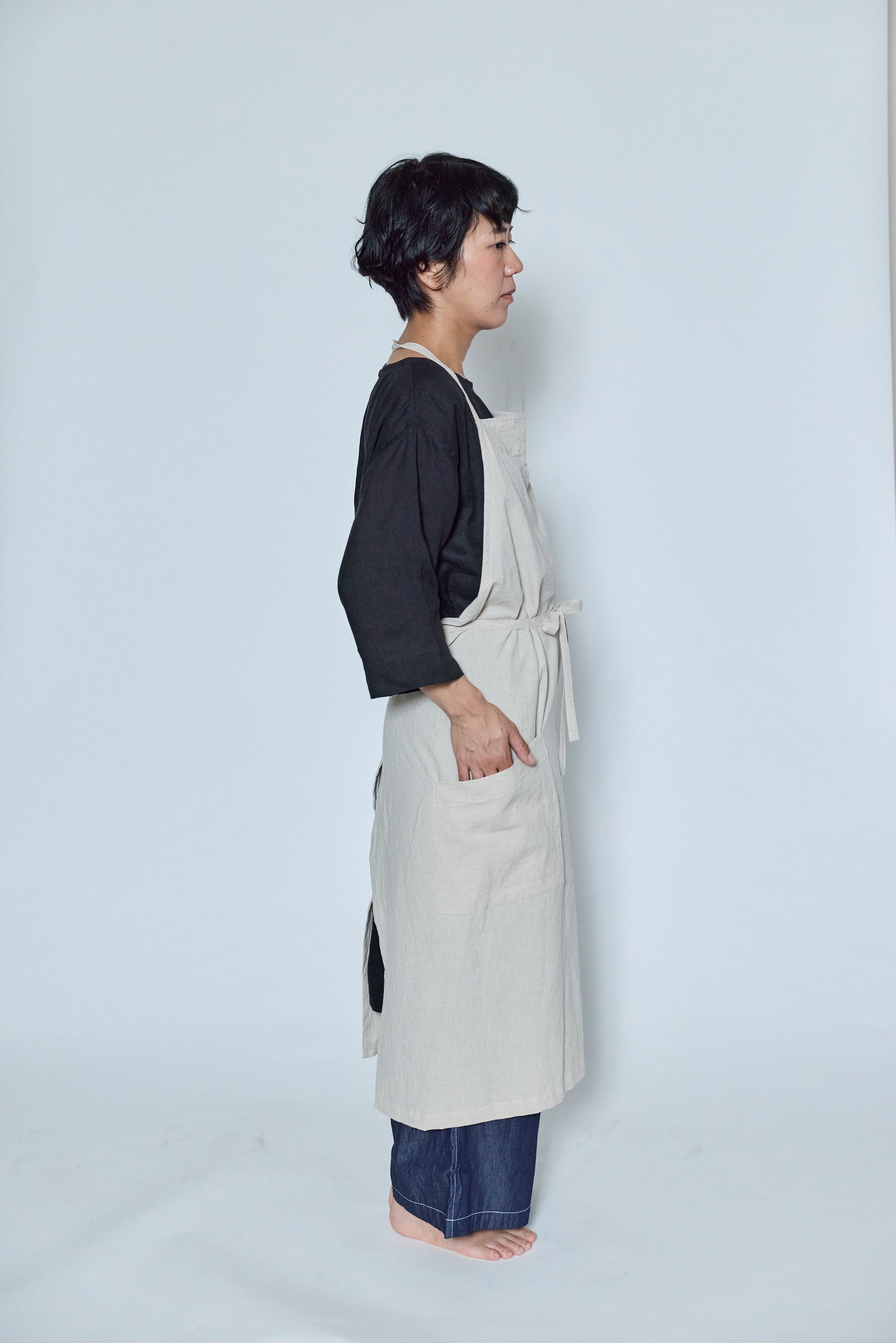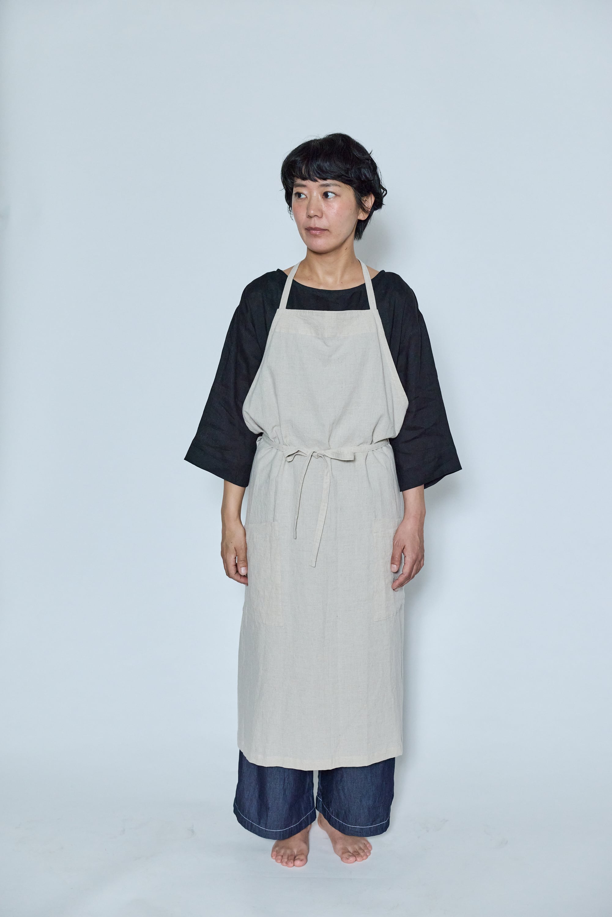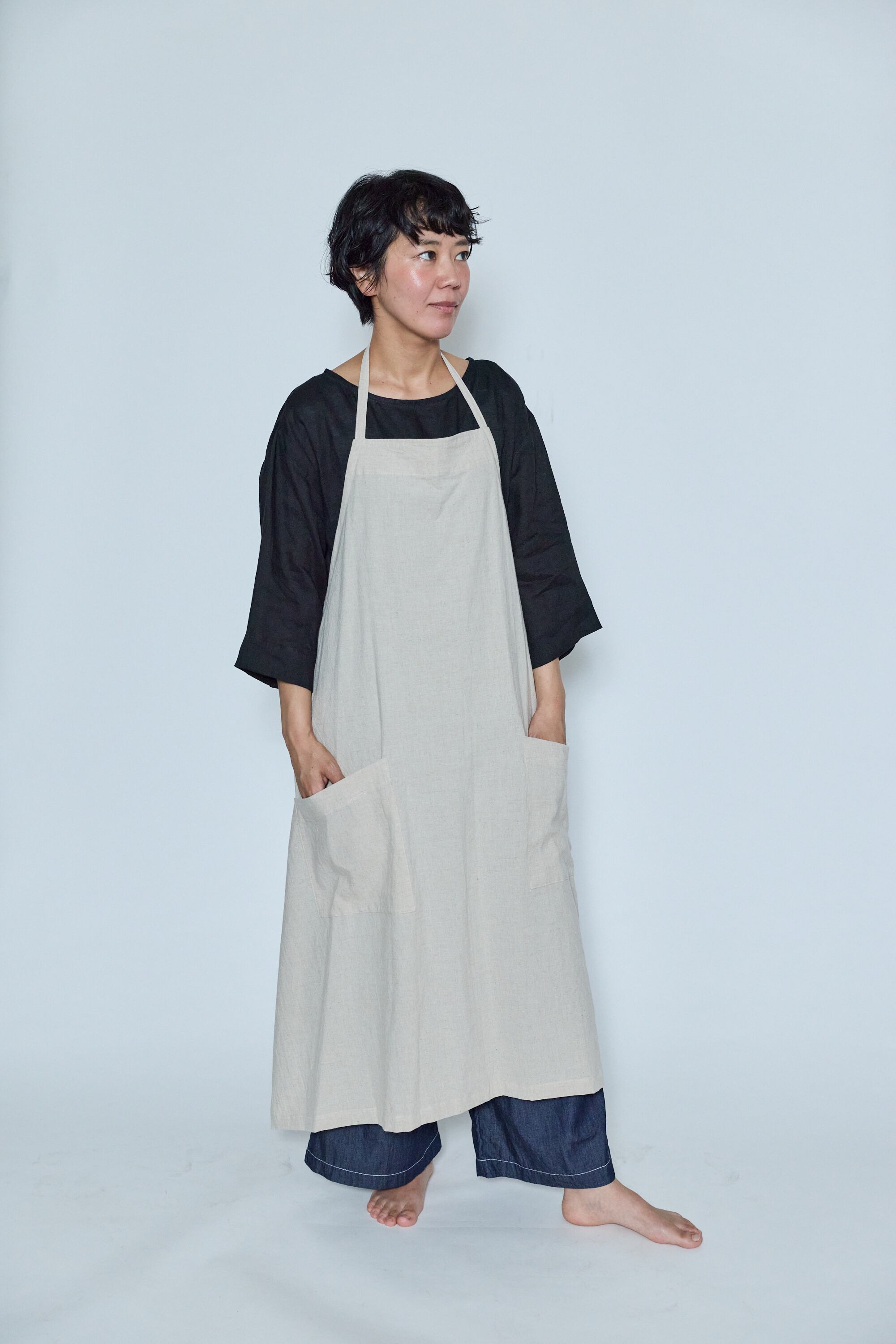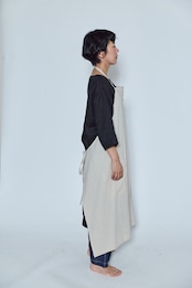 ベージュとスチールは麻100%、うすピンクはイカット機で織った無地の手織り生地でつくったエプロンです。